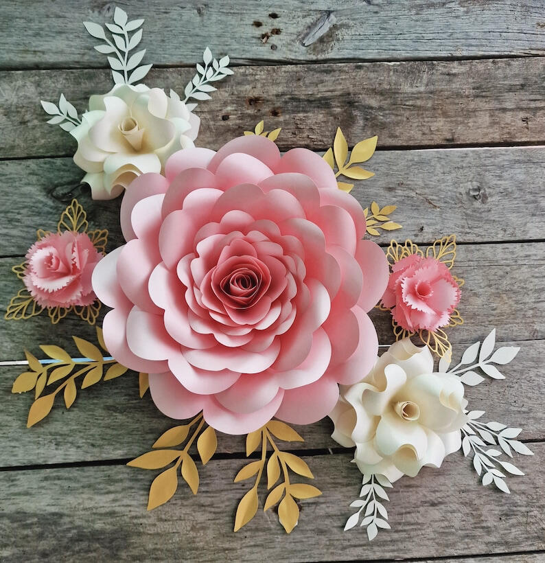 Wall Decor with Light Pink and Champagne Paper Flowers carefully crafted