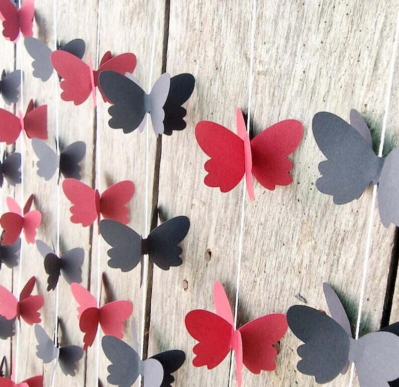 Bring a flutter of color to any celebration with our Vibrant Colored Paper Butterfly Garland. Each garland is a cascade of beautifully crafted butterflies, available in a spectrum of colors to perfectly match your wedding, baby shower, birthday party, or home decor needs. These 3D garlands create a stunning visual effect, making them ideal for garden parties, tea parties, or as a charming addition to your nursery decor. Handmade with care, our butterfly garlands promise to transform your space into a magical setting, making every moment memorable. Hang them as a standalone feature or combine with other decorations for a layered look that's uniquely yours. Experience the joy of decorating with our versatile and eye-catching butterfly garlands.Handmade10 strands 120cm each Colors:Red and Black