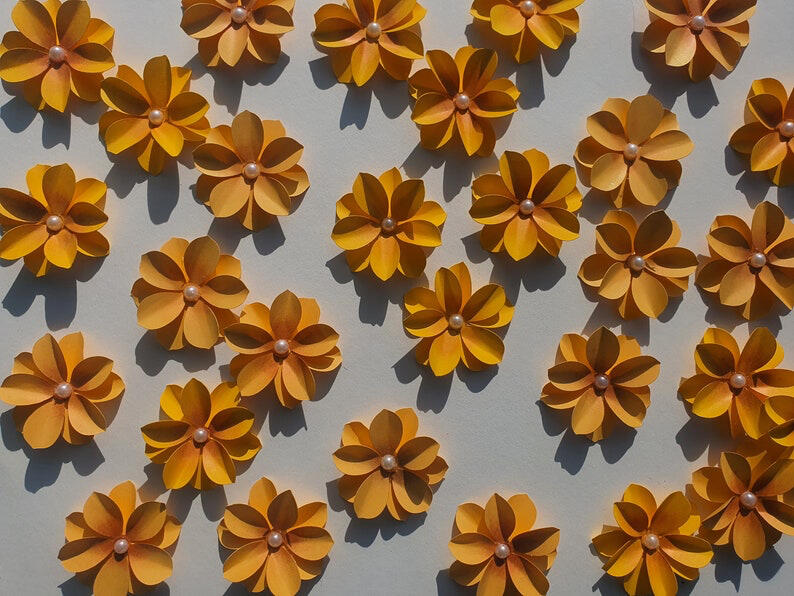 A collection of paper flowers, predominantly in a cream color with gold accents, likely intended for use as home decor. The design features a variety of flower styles, some with layered petals and pearl embellishments in the center, accompanied by gold paper leaves.Our 'Gold-Accented Cream Paper Floral Arrangement'. Handcrafted with precision, these cream paper flowers with golden leaves and pearl details add a touch of luxury to any room. Ideal for sophisticated home accents, wedding table centerpieces, or elegant event decorations, these versatile blooms create a serene and upscale ambiance.Experience the charm of these long-lasting, beautiful paper decorations that are perfect for celebrations or everyday elegance. Personalize your arrangement for a bespoke touch that fits your unique style and occasionHandmade