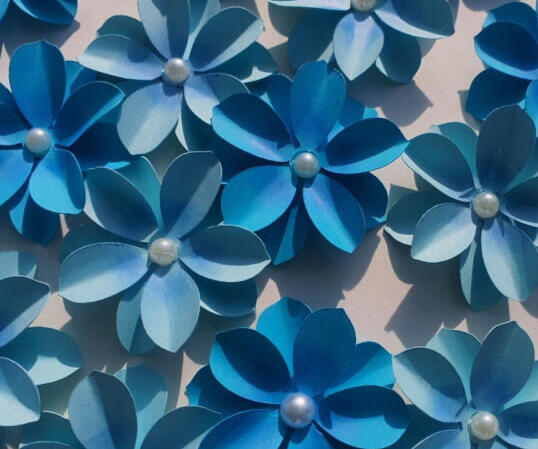 The perfect addition to your sophisticated event decor or to enhance your home's ambiance. Each piece is meticulously handcrafted, featuring deep navy and shimmering gold paper flowers with a beautifully details, creating a 3D effect that breathes life into any room. Ideal for wedding decorations, anniversary celebrations, or chic living room and office walls, this paper art transforms your special occasions.Crafted from cardstock the flowers are in varying shades of blue and a metallic gold, with detailed cut-out patterns in the petals and leaves