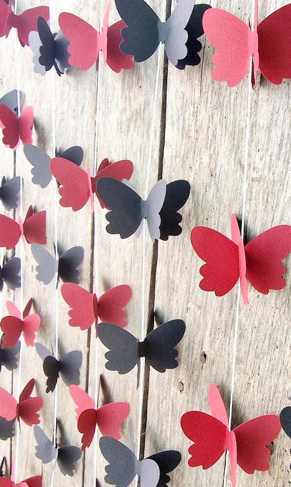 Bring a flutter of color to any celebration with our Vibrant Colored Paper Butterfly Garland. Each garland is a cascade of beautifully crafted butterflies, available in a spectrum of colors to perfectly match your wedding, baby shower, birthday party, or home decor needs. These 3D garlands create a stunning visual effect, making them ideal for garden parties, tea parties, or as a charming addition to your nursery decor. Handmade with care, our butterfly garlands promise to transform your space into a magical setting, making every moment memorable. Hang them as a standalone feature or combine with other decorations for a layered look that's uniquely yours. Experience the joy of decorating with our versatile and eye-catching butterfly garlands.Handmade10 strands 120cm each Colors:Red and Black