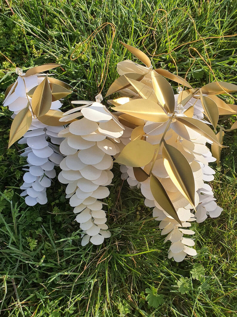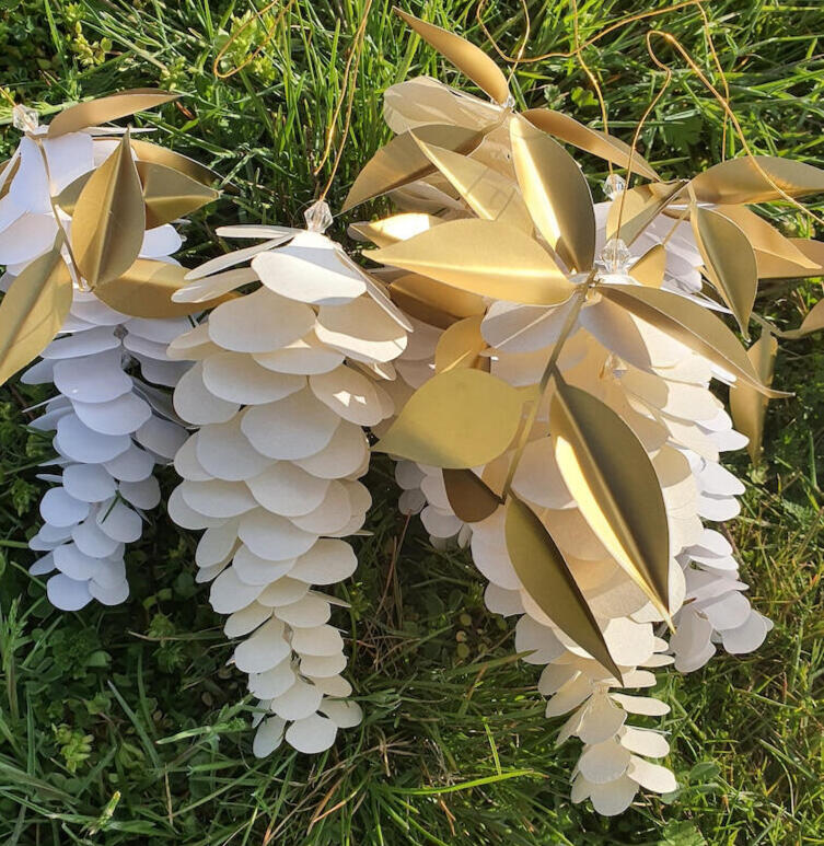 Discover our handcrafted Paper Wisteria Garlands, an exquisite addition to your wedding or festive home decor. These delicate gold and white paper leaves mimic the natural elegance of wisteria, creating a serene ambiance for any occasion. Ideal for enhancing wedding backdrops, adding a touch of nature to your living space, or celebrating seasonal events with style. Our durable and versatile paper wisterias are a must-have for those seeking a unique, nature-inspired aesthetic. Shop now to transform your space!Handmade