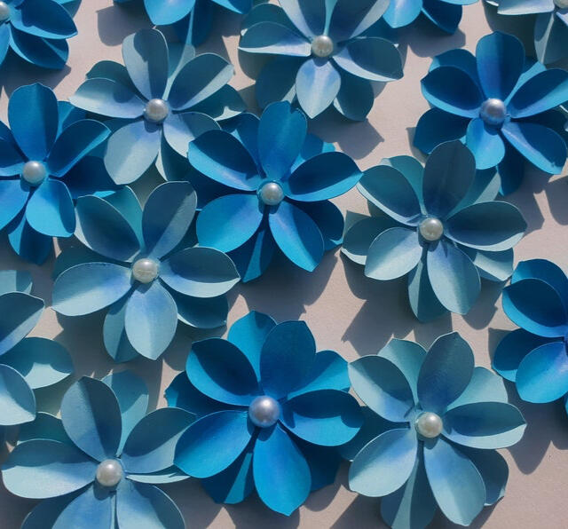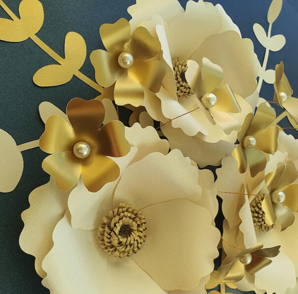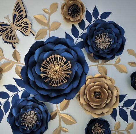 The perfect addition to your sophisticated event decor or to enhance your home's ambiance. Each piece is meticulously handcrafted, featuring deep navy and shimmering gold paper flowers with a beautifully details, creating a 3D effect that breathes life into any room. Ideal for wedding decorations, anniversary celebrations, or chic living room and office walls, this paper art transforms your special occasions.Crafted from cardstock the flowers are in varying shades of blue and a metallic gold, with detailed cut-out patterns in the petals and leaves